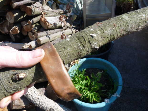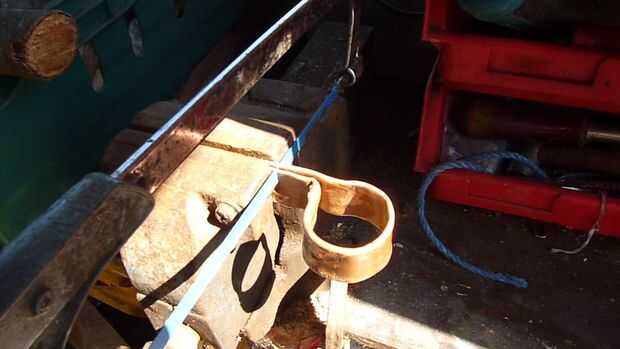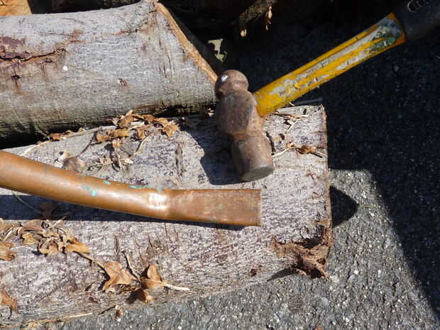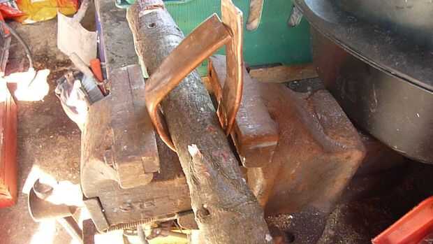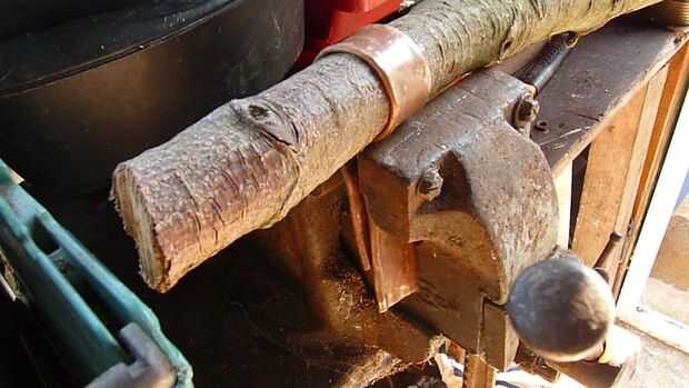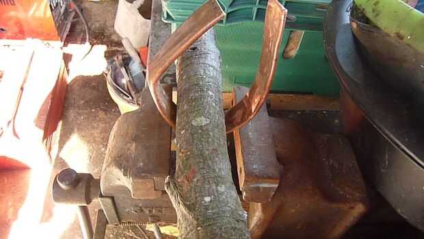 Usa un tramo corto de tubería de cobre de 22 mm, que era plano martillado y formado alrededor de una rama en la prensa como se muestra. El Vicepresidente fue utilizado para cerrar la abrazadera alrededor de la rama que era aproximadamente el mismo tamaño que la bomba.