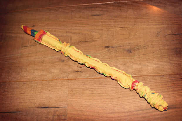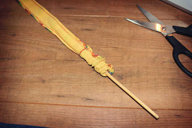 Cosí las tiras de la tela Junta, sin embargo podría, para hacer tiras de tela que fueron aproximadamente 2 pulgadas de ancho y como puedo conseguirlos a partir de una sola manga. Cortar las tiras de alrededor de 2 pulgadas de ancho, siempre que podía. En algunos casos, sin embargo, debido a las costuras en las mangas, no funcionó hacia fuera, y tuvo que cortar un poco más pequeño y cosidos juntos para conseguir que sea aproximadamente la misma anchura. Repite el proceso con la otra manga.