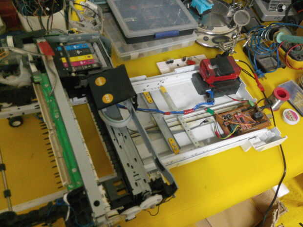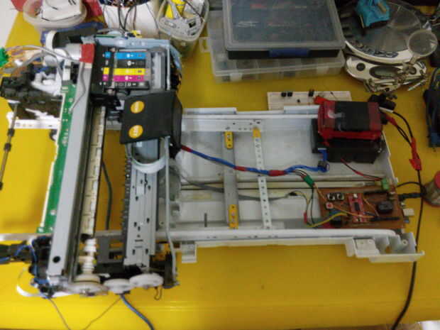 El objetivo de este proyecto es hacer latte impresora, he utilizado 1 impresoras y 1 scanner, imprime una línea de un tiempo, todo lo que he hecho es cortar los sensores de la impresora y utiliza Arduino Uno para enviar valores diferentes al escudo personalizado creado de los micro-controlador de la impresora para control de motor paso a paso y hacer otras tareas..., simplemente deje engañar a la impresora , hacerlo imprimir con los sin papeles :)