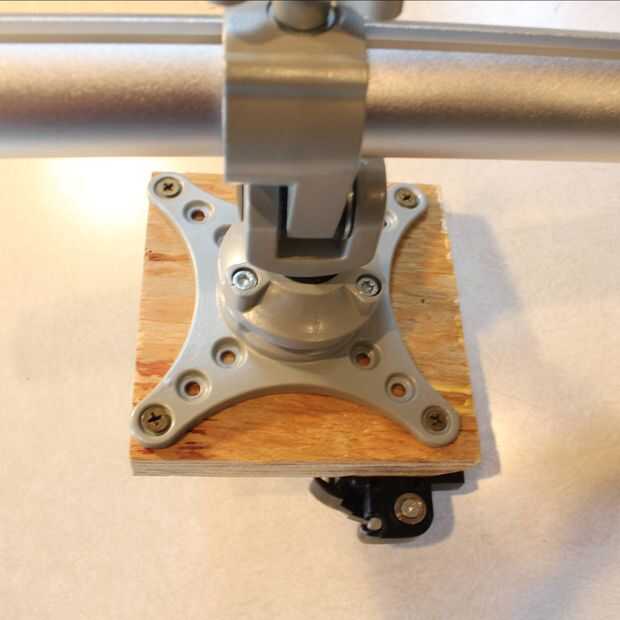 2. corte un pedazo de madera contrachapada de 1/2" o 3/4 (aprox. 5" x 5") y fije el soporte de monitor con cuatro tornillos para madera