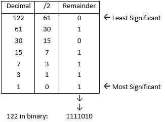 La tabla anterior muestra el número decimal 122 en binario. Continuación se describe el proceso para convertir de decimal a binario.
