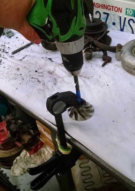 Para adaptarse a la bala ampliada del orificio central debían ampliarse. Compresor más ruedas están fabricadas en aluminio fundido, así que no debe ser es gran cosa para agarrar un taladro y agrande el orificio...