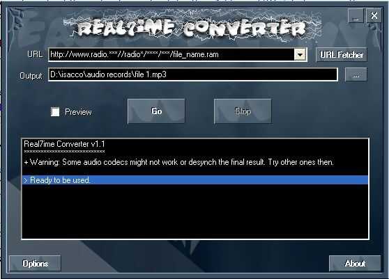 Real7ime Converter (R7C) es un convertidor de cualquier RealPlayer streaming de medios (video y sonidos) a formato AVI/WAV/MP3. Rel7time no es un downloader. Juega el streaming de Real Audio y graba en otro formato (MP3, wave u otros) en tiempo real. Esto implica que diez minutos de streaming de la grabación toma diez minutos. Sin embargo varias grabaciones pueden llevarse a cabo al mismo tiempo iniciando múltiples ventanas de Real7time.