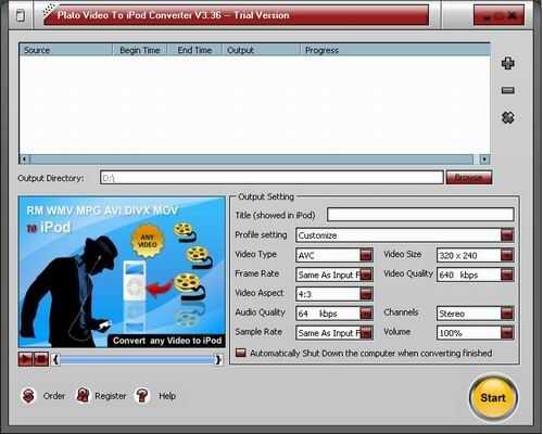 http://www.popshareware.net ) Platón vídeo a iPod Convertidor - simplemente convertir cualquier vídeo en tu iPod, puede convertir casi todo tipo de archivos de video tales como rm, divx, xvid, avi, wmv, asf, mpg, mpeg, vob, mov, qt, vcd, svcd al formato de video (mp4) iPod de Apple. Automáticamente apagar su computadora después de la conversión de tiempo largo, tales como grandes archivos conversión a medianoche. Agregar automáticamente archivos de ipod a iTunes después de la conversión.