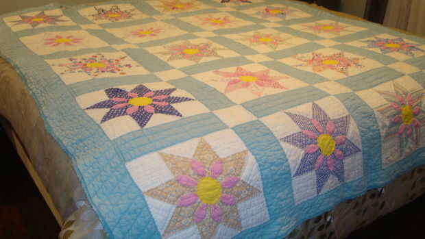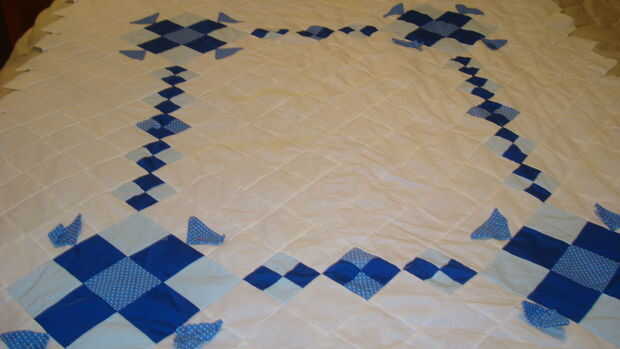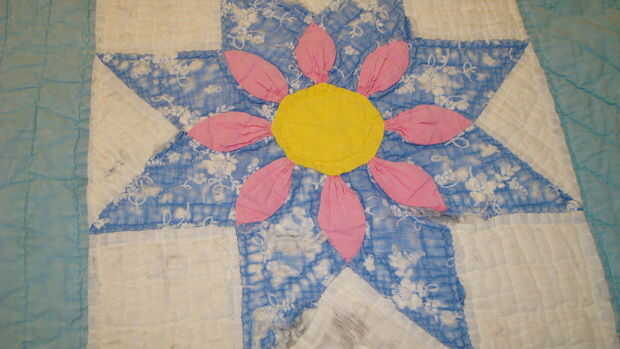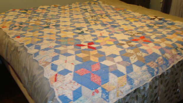 Aquí hay algunos tejidos que se han utilizado mucho.  Debe haber sido muy queridos en su tiempo por miembros de la familia.  Calculo que al menos 70 años de edad y son totalmente cosidos a mano.   Los 2 últimos son sólo edredón tapas.  Voy a acabar con ellos.  Si usted tiene cualquier edredones muy desgastados y no los quieren personalmente, le sugiero que aferrarse a ellos y pasarlos a sus hijos porque los edredones cosidos a mano tienen mucho valor.  Tarda mucho tiempo para hacerlos.  Estoy seguro que sería un antepasado que le encantaría tener uno de estos tipos de tejidos.  Los tejidos teñidos y desgastados tienen mucho carácter y podrían enmarcarse.  Algunos se pueden reparar. Alguien podría hacer tesoros fuera de ellos, incluso si están en mal estado con un poco de imaginación.