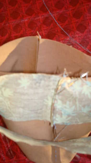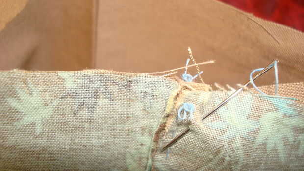 Cortar 2 muy pequeñas hendiduras en la capa superior única de la bolsa, (en la parte posterior, en cada extremo.) (para tirar de la cinta a través). Asegúrese de que separar a la tela para que no corte completamente a través de las capas.