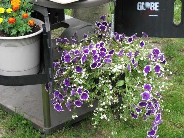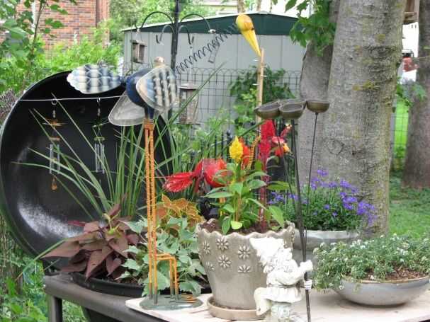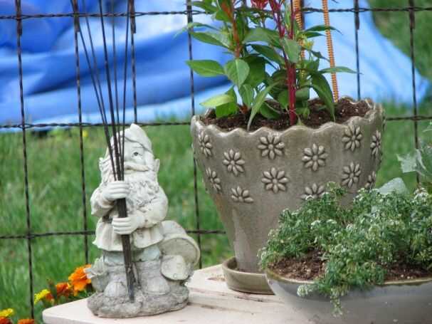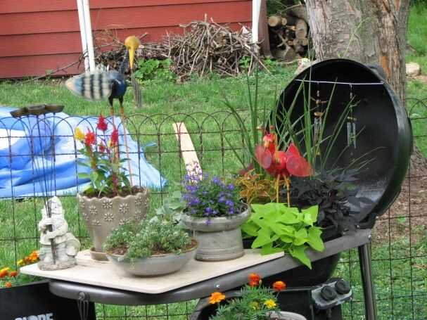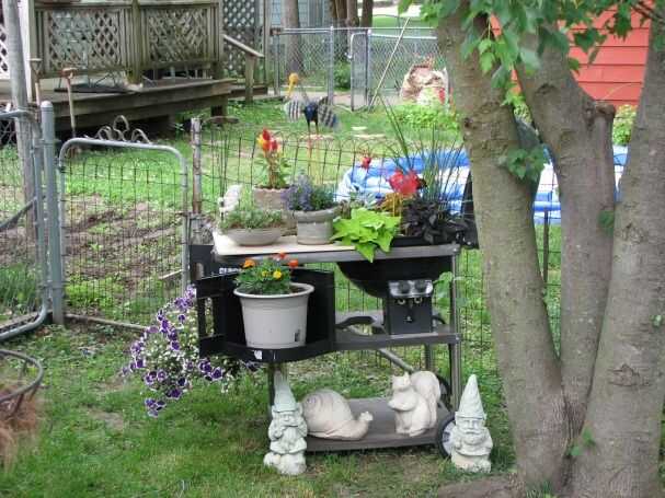 Segundo, planté la vasija de barro. No tiene orificios de drenaje, así que puse una buena capa de guijarros de guisante en la parte inferior antes de que añadí el suelo y plantar las plantas. Se puede observar al mirar en la siguiente serie de fotos que la regadera se ha sustituido por un tercer pote de cerámica. La regadera fue dado a mi esposo por uno de sus clientes siega cuando era un adolescente. Ninguno de nosotros podría traer nosotros mismos a utilizar para un propósito que sería así que nos fuimos de compras otra vez y encontró una vasija de barro que complementa las otras dos macetas cerámica del moho. En este punto, se volvió mi socio siembra. Perforar dos agujeros pequeños en la tapa e inserta una pequeña barra con los dos carillones de viento colgando de él. Caminó alrededor de la parrilla y decidió que algo faltaba, así que nos fuimos a nuestro cobertizo para ver lo que hemos podido encontrar. Encontramos mi nerd aves y mi medidor de agua de gnome. Estos realizan excelentes adiciones a la parte superior de la parrilla. Aún así, algo faltaba. La parte delantera de la parrilla entre los estantes dos puertas era muy pelada, como el estante inferior de la parrilla. Volvió al invernadero y encontró una jardinera colgante lo suficientemente grande como para llenar el espacio entre los estantes de la puerta. Perforar un agujero en el centro de la manija de la rejilla y luego atornillados la jardinera colgante que. Ponemos una arandela al lado de la plástica en el frente y volver a añadir fuerza a la suspensión del plástico. Luego volvimos al jardín cobertizo y cuatro amigos jardín de cemento a agregar a la zona del estante inferior.