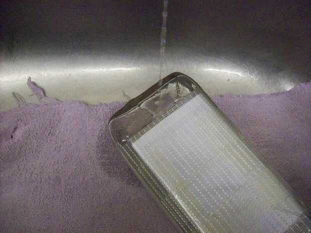 Asumir su botella en el fregadero. Vas a querer correr agua sobre el punto de contacto entre el vidrio y como trabajas para lubricar la broca y minimizar el riesgo de un crack en desarrollo. Como se puede ver en la imagen no tiene que ser un torrente, lo suficiente como para mantener las cosas moviéndose suavemente. Obviamente no puedo tomar fotos y mantenga el frasco y el taladro (probé más adelante y verás lo que eso condujo a!) pero en cuanto a la velocidad de la perforación entra en el temprano va usted puede conseguir lejos con un RPM bastante alto, casi completo en mi taladro pero son todas diferentes por lo tanto ese sentido común que estábamos hablando antes.