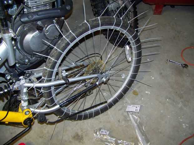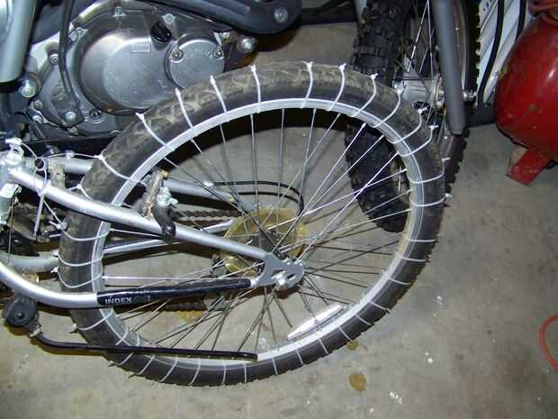Ahora para dar un agarre, hay que hacer cadenas para la nieve-amarra en la rueda trasera. Simplemente distribuir lazos zip generosamente y uniformemente alrededor del borde trasero y luego clip de la etiqueta. Terminé usando unos 35-ataduras de cremallera para mi rueda trasera, pero es un 24" así que probablemente utilizará más si el volante nos más grandes.