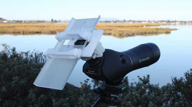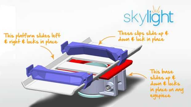 El tragaluz logra estos tres pasos y se desliza en la x, y y z ejes que le permitirán posicionar correctamente diferentes smartphones tamaño. El plano focal del ocular será cierta distancia fuera del ocular. Esta distancia es llamada la distancia de relevación del ojo, y será diferente para distintos tipos de oculares. El tragaluz puede deslizar hacia arriba y hacia abajo en el eje del ocular (aflojando la abrazadera en C) para acomodar distancias de socorro de ojos diferentes. * El tragaluz acomoda oculares con por lo menos 1,3" del ocular expuesto y diámetro exterior menor o igual a 1.75".