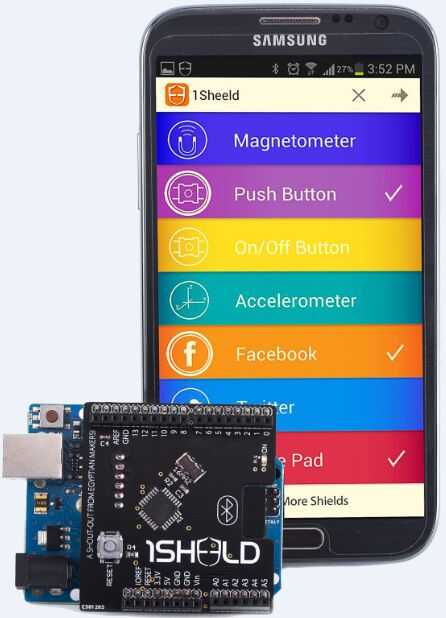 Hola chicos, soy uno de los creadores de 1Sheeld, es una aplicación móvil y una placa que convierte tu smartphone en una plataforma abierta para Arduino.