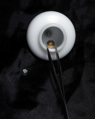 Ahora añadir la arandela de metal encima de la arandela de plástico.