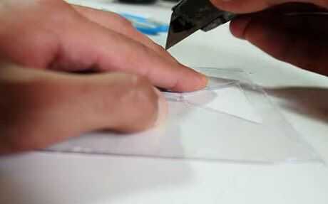 2) broche de presión las partes poco profundas de la caja del CD y cuidadosamente traza alrededor de la plantilla de papel cortar la forma del plástico transparente. Repetir cuatro veces.
