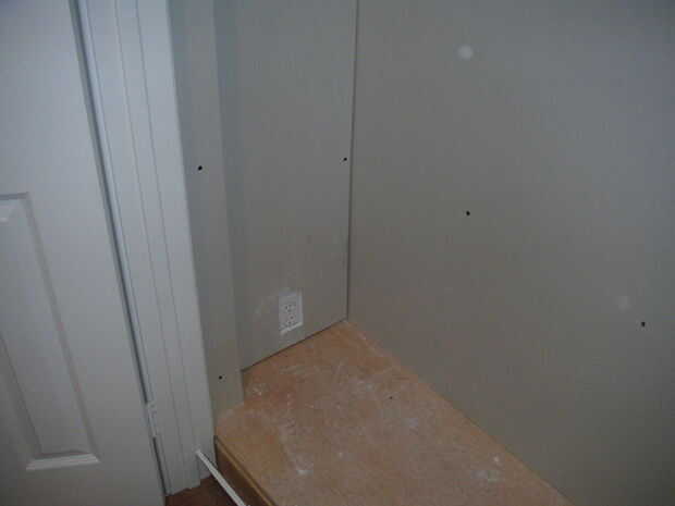 OK, en este punto usted puede haber notado que algunas de mis fotos se ven fuera de lugar. Es debido a la secuencia en la que he construido las paredes. Primero construí el interior paredes frente y la espalda completamente (es decir, estructura, aislamiento y drywall). Luego regresó y construyó las paredes laterales (una vez más, marco, aislamiento y paneles de yeso). Tuve que hacerlo así para que los extremos de cada yeso tope contra un 2 x 4. Piense en ello como una "L" con dos rectángulos. Usted no puede cortar en un ángulo de 45 grados, así que un borde va a superponerse a la otra.