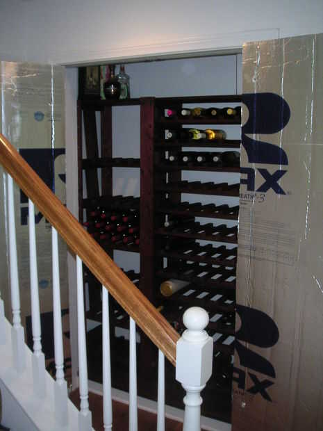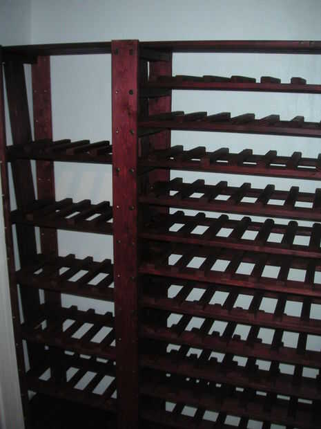 Mi diseño básico era utilizar dos tercios del espacio para el almacenaje de la botella sola y el tercio restante para el almacenamiento de caso. He creado un bastidor principal con botelleros de Gorm en cada nivel a excepción de un nivel abierto en la parte inferior para botellas tamaño magnum o champagne. Para caso de almacenamiento, me cortar varios botelleros de Gorm y sólo las instaladas en cada nivel del otro. Tuve que añadir pequeñas vigas de soporte vertical en los laterales, para que las botellas no resbalón hacia fuera los lados cuando se apilan. No fue gran cosa como tenía un montón de material de desecho 2 x 4.