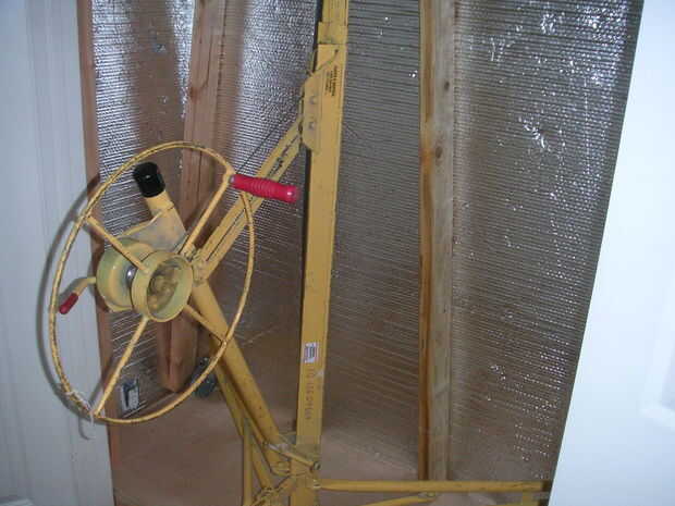 Otra vez, porque todo lo había medido antes de instalar la barrera de vapor, mi marco era un pelín grande para el espacio. También, tratando de girar el marco en el armario era sumamente difícil porque estaba usando 2x6s. Mi esposa estaba pacientemente mientras gritaban obscenidades en el mundo. Por alguna razón, mi dolor era su entretenimiento. Si iba a hacerlo de nuevo, construyo el marco desde dentro del armario, en lugar de fabricarlo y trata de instalar todo.