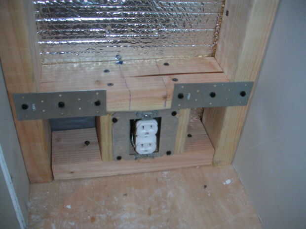 Un gran beneficio que tengo es una toma de corriente dentro del armario. Sin embargo, me preocupaba con la placa de pared bombear hacia fuera y tal vez presionando contra el portabotellas. Mi solución fue instalar la placa de pared detrás de la pared y luego usar un montón de mezcla de tablarroca para suavizar los bordes. El pro es que la salida ahora es empotrable. La contra es que si alguna vez necesito esa salida de servicio, tendría que cortar el drywall.