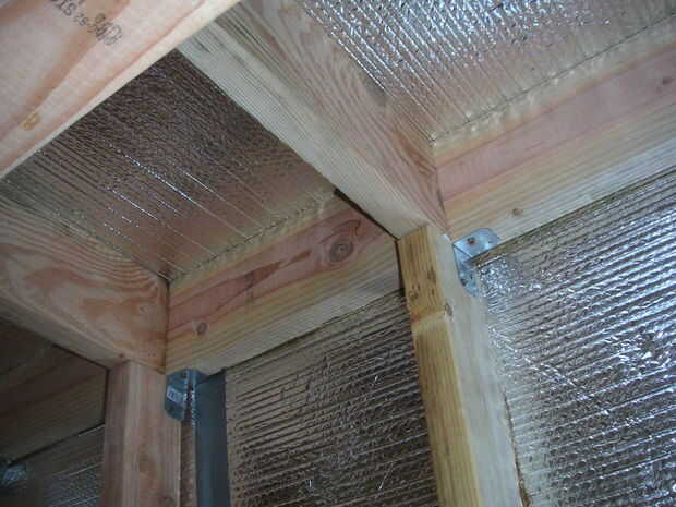 Este paso realmente ocurre en el centro del paso previo, ya que los montantes de la pared ten la estructura de techo en lugar. Sólo menciono este paso como una independiente debido a la técnica utilizada para fijar los montantes del techo y el piso. Después de leer The Home Depot, encontré una variedad de conectores de la estructura. Se puede ver en las imágenes que cada pared fue asegurado a la estructura del techo y el suelo mediante soportes en L. La separación estándar entre postes es de 16".