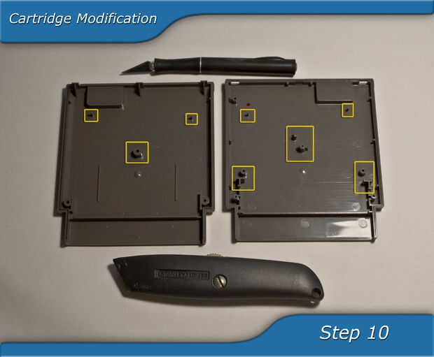Con la X-acto cuchillo y caja de herramienta de corte, retire las lengüetas de plástico en los cuadros amarillos