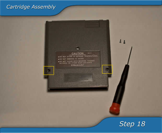 Con el disco acoplado finalmente con la parte trasera del cartucho del juego, todo lo que queda por hacer es volver a colocar la cara frontal. Utilizando el pequeño flathead destornillador, vuelva a instalar dos tornillos desde el proceso de desmontaje. El tercer tornillo no se ajusta debido a la presencia de la unidad de disco duro dentro.