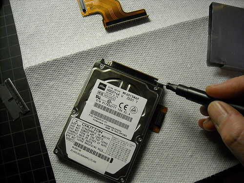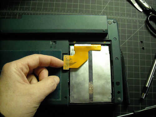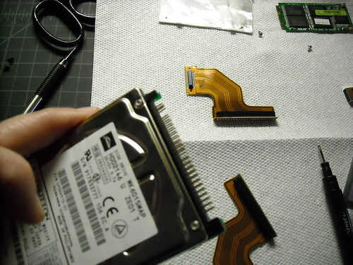 La cinta está conectada a la Motherboard, Tarjeta madre en el lado izquierdo. Suavemente levante este extremo y desenchúfela. Ahora debe ser capaz de eliminar el disco duro. Quite la manga y poner en lugar seguro. El siguiente paso es quitar el conector de la cinta del disco duro. Esta es la parte más difícil del proceso. La cinta podría dañarse fácilmente y se une muy bien al disco duro. Utilicé una hoja de afeitar para un espacio entre el conector y la unidad de disco duro y luego usé un destornillador pequeño para continuar levantando la cinta hasta que pude levantar completamente fuera de la unidad.