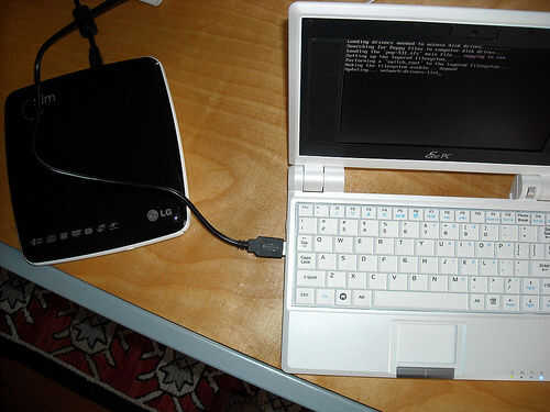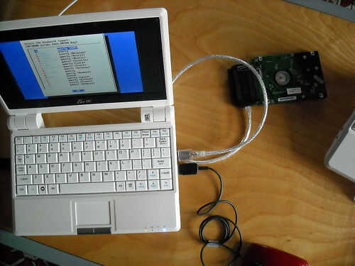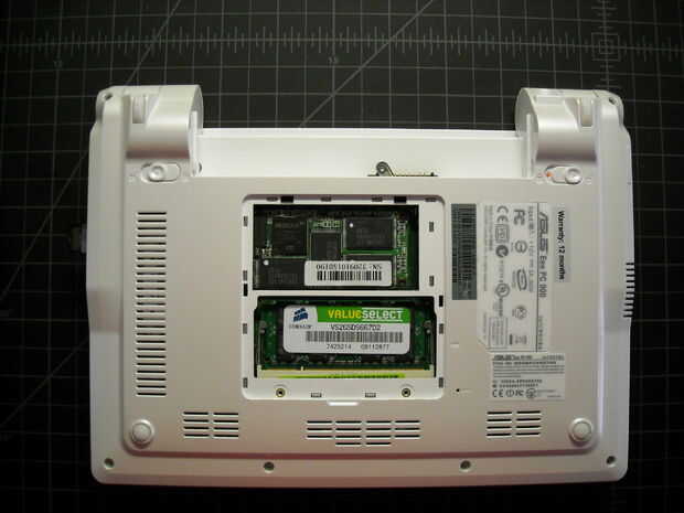Las fotos de abajo muestran los pasos para quitar el disco duro de la Pc de Eee. Sólo invierta los pasos para volver a instalarlo.
