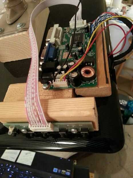 Luego necesitas conectar el controlador del LCD a la tapa del portátil. Para ello, atornille en algunas secciones de la madera desde el interior de la tapa. Luego en la parte exterior de la tapa Coloque el tablero de control de LCD. Coloque la madera en un área donde puede llegar la tarjeta de control.