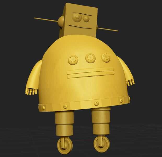Como con rostros humanos y cuerpos, las asimetrías de este robot mejoran este personaje. Tenga en cuenta las asimetrías de su pose, sus cejas y boca y de su postura. Estos detalles dan el carácter a la vida.