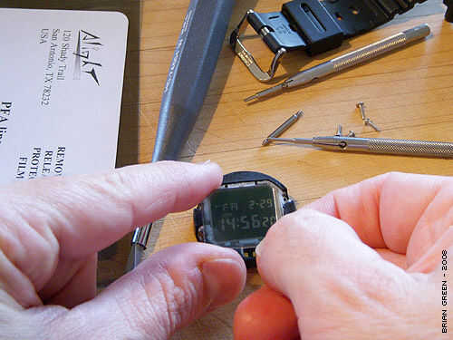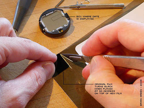 Una vez que han cortado el nuevo pedazo de película polarizante, sostener sobre la pantalla para asegurarse de que cabe y que va a crear el deseado efecto negativo. La película usada aquí (detalles en la parte superior) era autoadhesiva en un lado y tenía una cubierta protectora en el otro. Retire la tapa del lado de autas-adhesivo y sin tocarlo con cuidado coloque la pieza nueva de película polarizante en la pantalla de vidrio. Usa sus pinzas para mejor precisión. Suavemente frote la película polarizante con un trapo suave o limpiar q-Tip para asegurarse de que adecuadamente se pega hacia abajo. Otra vez utilizar sus pinzas para elevación de la cubierta protectora de la parte delantera de la película. Usted debe dejar con una superficie libre de manchas y huellas dactilares.