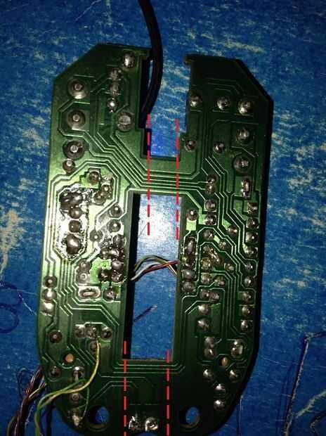 PCB de ratón en dos partes. Te recomiendo cortar con un cuchillo de cocina normal a partir del lado de la PCB con las rutas de cobre. Marcar primero una línea recta que divide la placa en dos partes iguales y luego empezar a cortar con los suaves movimientos del cuchillo. Esto evitará que el pelado del corte de rutas cobre blanco. Después de cortar por favor tomar nota de todas las rutas que fueron afectadas (generalmente solo algunos de ellos). Seguimiento de cada uno de ellos al nodo más cercano y conectar los correspondientes con los cables. Una vez más los cables deben ser lo suficientemente largos. Usted puede necesitar una lupa para asegurarse de la encaminamiento. Algunos componentes como la rueda de desplazamiento no serán necesario en este proyecto, por lo que deben eliminarse.