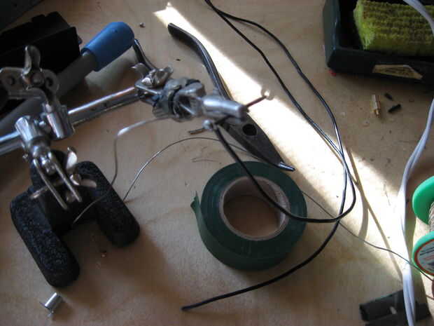 Arena abajo las uñas así que no hay ninguna capa en ellos y les de la soldadura en los extremos de los cables para hacer las puntas de prueba real (o, si realmente salió y consiguió las puntas de prueba real, soldarlos en los extremos de los cables). Después de eso, cinta del empalme de la soldadura y listo!