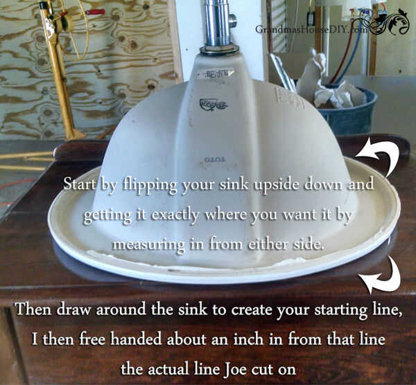 Dibujé una línea alrededor del fregadero con un marcador mágico después cuidadosamente midiendo y consiguiendo el fregadero exactamente centrada. Retirar el disipador entonces solo gratis entregué una segunda línea de aproximadamente una pulgada en desde la primera línea para que el fregadero tenía una pulgada de madera para sentarse una vez que estuvo en el lugar. Desde allí Joe puso una nueva hoja de madera fina en nuestra Sierra de vaivén poco y corte cuidadosamente el orificio del fregadero. Nota: Él también entregó un preorificio por taladrar un agujero lo suficientemente grande con nuestro taladro por lo que tuvo un lugar para comenzar su corte.