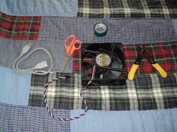 Para este proyecto necesitarás: Un ventilador pc tijeras un cable usb (no importa cual extremo del cable, siempre y cuando un extremo es un conector usb macho de tamaño completo) un pelacables y cinta aislante