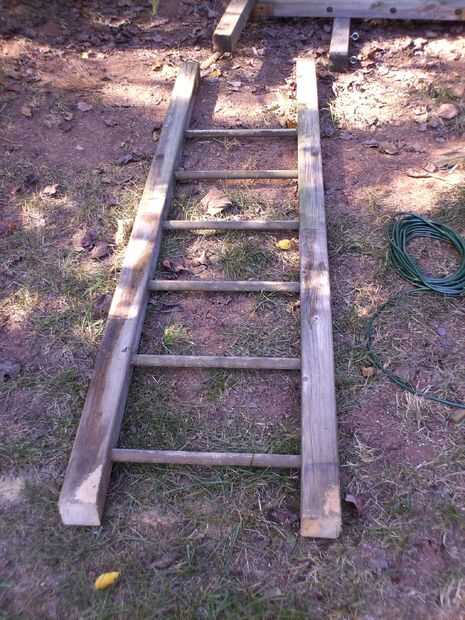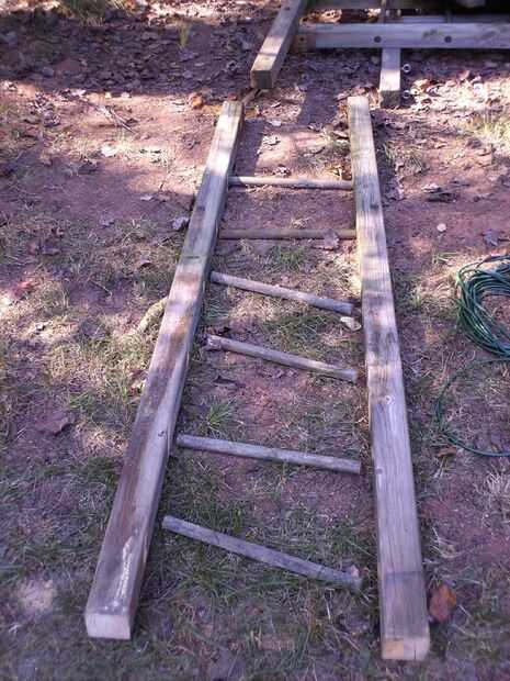 Una vez que separaron las columnas la base corté los peldaños escalados que todavía se unieron los dos puestos. Me di cuenta después de todos los peldaños eran que los clavos que habían sido conducidos a través de ellos se habían oxidado, que me permita hacer las secciones restantes del pasador de los postes.