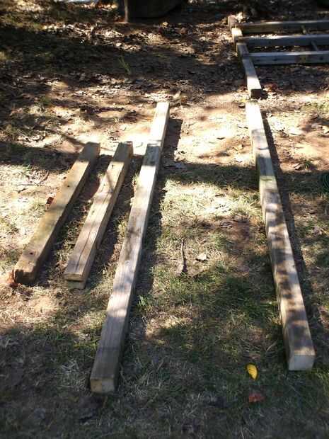 Había separado los postes verticales de 4 x 4 desde la base. Tuve que sacrificar unas pocas pulgadas de los puestos porque los tornillos de fijación a la base habían oxidado y no rompería libres. Sin embargo, esto todavía me dejó con los postes apenas tímidos de siete pies de altura. La madera de la base se corte por la mitad con el fin de ser utilizado para los soportes base de la Proposición.