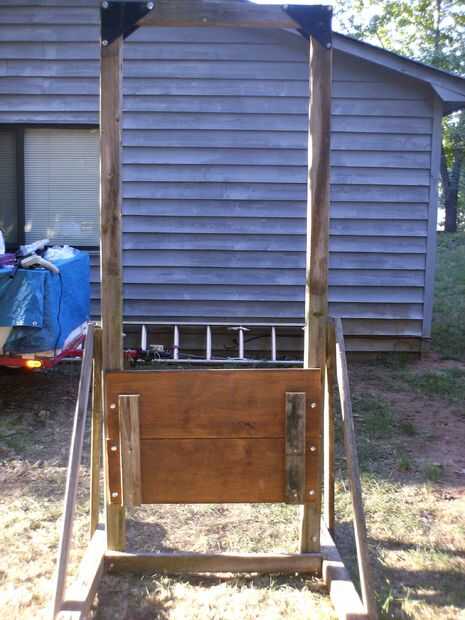 Tengo en mis manos y las rodillas entre los montantes y determinar el área aproximada donde debe ubicarse el centro de las poblaciones. Luego establece el apoyo y coloca la madera en los montantes. Una vez que el marco era cuadrado y la madera se reprimieron, perforé 1/2 orificios para los pernos de carruaje asegurarlos a los postes. Cuatro agujeros se perforaron en la parte inferior media, para un montaje permanente, mientras que sólo dos agujeros fueron perforados en la parte superior media. Esto me permitió usar las tuercas mariposa en los pernos superiores y ser capaces de abrir y cerrar las reservas para asegurar a las ' víctimas' en las poblaciones.