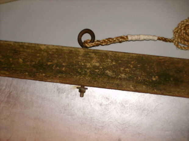Un pedazo particular de 2 x 4 fue elegido para la hoja del emparedado. La pieza trasera de madera fue perforada desde la parte superior hacia abajo para aceptar otro perno oxidado. Guita fue pasó por el perno, luego empalmada en un lazo del ojo y batida con pequeñas cosas para terminar el empalme limpiamente.