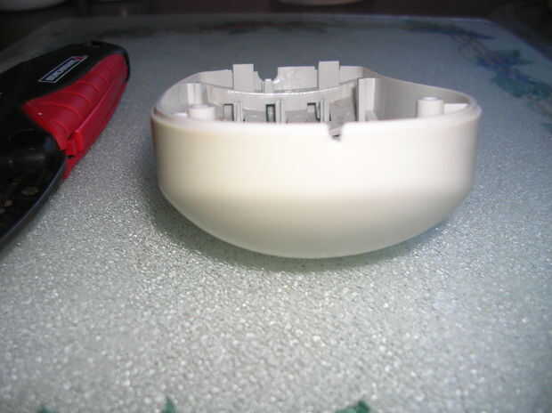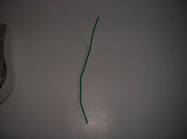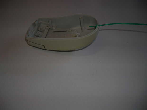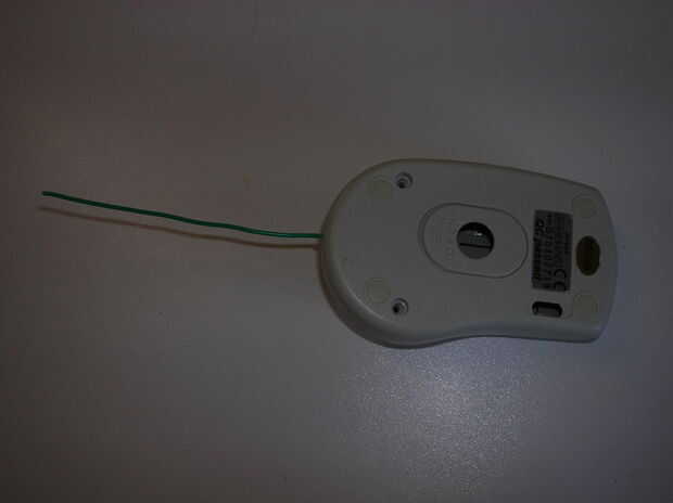 Ahora con una muesca de cuchillo hacia fuera un lugar en la parte posterior del ratón de la computadora lo suficientemente grande para encajar el alambre a través de. Después de usted han hecho que cortar un trozo de alambre de aproximadamente seis pulgadas de largo. Entonces haga un nudo en el cable cerca del final. A continuación pegamento caliente el alambre en la ranura que usted hizo antes. Ahora colocar la parte inferior en el ratón y ponga que los tornillos de nuevo.