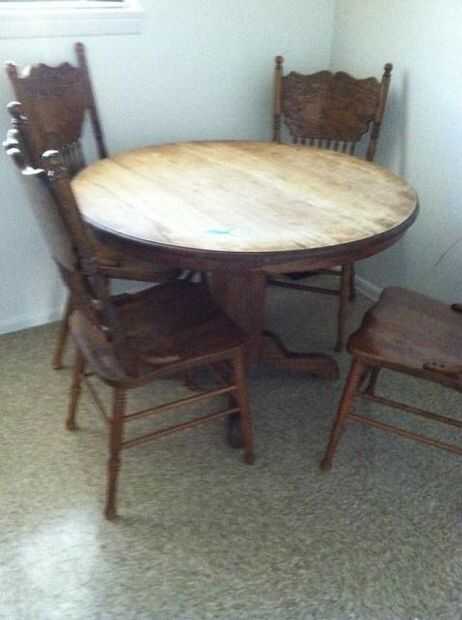 compré esta mesa de comedor ladyish anticuado, viejo y Presidente conjunto de $25 en Craigslist. Viendo que era de madera maciza, sabía que sería fácil de arreglar las manchas y arañazos con un poco de jabón y agua y un papel de lija.
