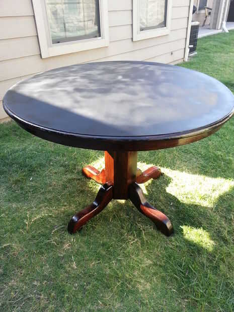 Aunque no tengo una foto del siguiente paso, usé cinta al borde de la parte superior de la tabla por lo que podría pulverizar la pintura de pizarra. Era fácilmente 100 más grados fuera aquí en Killeen, Texas, la pintura seca muy rápido y he podido aplicar varias capas en cuestión de pocos minutos. Una vez que se hizo la parte superior me quitado la cinta y comenzó con la mancha de madera en el borde de la mesa y las piernas un cepillo.