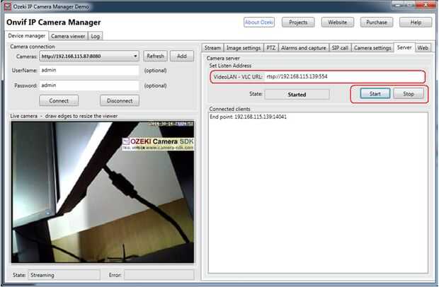 Puede probar el servicio con la nueva url que el SDK de cámara Ozeki implementar para usted. RSTP://camera_url:Port por ejemplo rstp://192.168.115.139:554