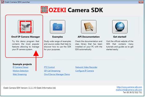 Tras hacer clic en el lanzador obtendrá una ventana donde tienes que elegir el administrador de cámara IP de Onvif. Ozeki cámara SDK dar le solución, ejemplos, documentación de la API para llegar a la cámara con el servicio de Onvif.