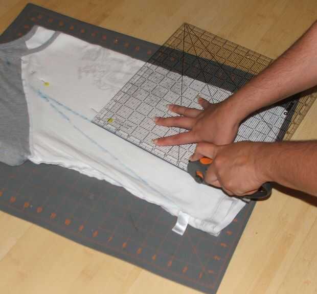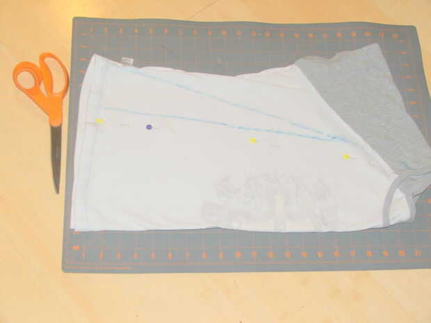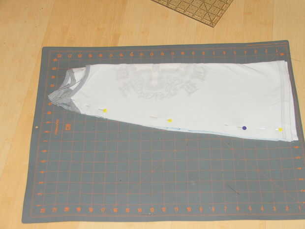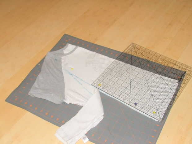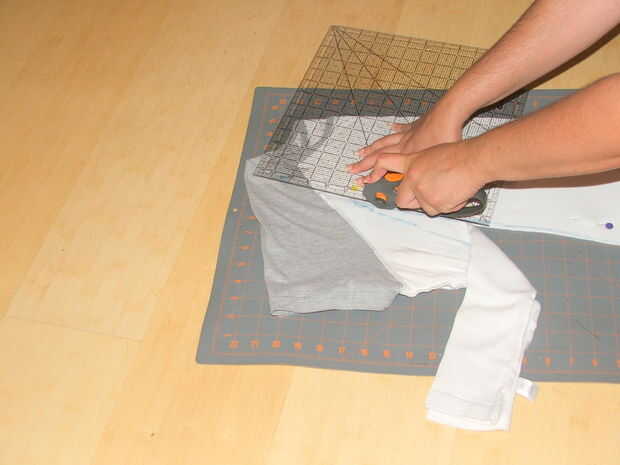 Corte a lo largo de la línea, ya sea con tijeras o rotary cutter & mat. Utiliza un cortador rotatorio para la mayor parte de la camisa, luego utiliza tijeras para cortar a través de las costuras donde el cortador era quedarse atascado.