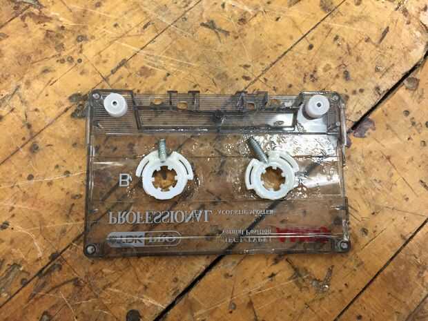 A continuación, usted tendrá que cortar las ranuras en las ruedas. Usé el archivo de diamante para esto también. Porque el espacio es limitado, usted tendrá que cortar la rueda también, en orden para que pueda caber en la cinta junto con todo lo demás. Yo utiliza la dremel para cortar la parte exterior de las ruedas. Pegué las ruedas utilizando los 5 minutos Epoxy y endurecedor de Epoxy. Sólo les mezcle y aplique la cinta y las ruedas. Una abrazadera en C es opcional si desea mantener las ruedas en su lugar mientras seca, aunque decidí no utilizarlos. Una vez que haya secado, tendrá que pegar los tornillos en las ranuras. No tengo tornillos M3 disponibles, como Instructable de BrittLiv, usé lo que sentí que sería un buen tamaño. Se trataba del mismo tamaño que un tornillo de M3 en altura, pero tuve que dremel la cabeza y parte de su tornillo así que había más espacio para los interruptores de la acción de complemento. Al tiempo, los pegamentos de Epoxy estaban disponibles, por lo que he usado resina de Epoxy y endurecedor de Epoxy. Otra vez, me mezclan estos dos y había aplicado a las ranuras de la rueda y los tornillos. Esto obviamente tuvo más tiempo para secar en comparación con usando el otro pegamento, por lo que se recomienda el pegamento de Epoxy minutos 5. Porque yo no he puesto la cinta magnética hacia atrás dentro del cartucho, que parecía casi inútil cortar los 10 cm de cinta magnética para más adelante, pero lo hice de todos modos, tal como había mandado a BrittLiv.