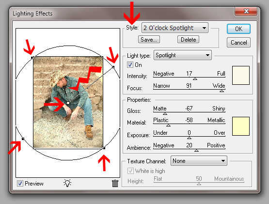 Ahora, en la ventana de vista previa, verá que esto es hacer a nuestra imagen. Hacer su mirada de iluminación como en el ejemplo proporcionado (imagen 2). Para ello, es necesario manipular funcionamiento este efecto en la foto. La dirección de que la luz está viniendo es indicada por la línea actuando como un radio; imagen 2 puso un perno de la iluminación junto a él. El muy pequeño círculo blanco nos muestra el centro del efecto. Asegúrese de que su blanco círculo (hay un punto de flecha roja a él) en el centro de nuestra imagen.