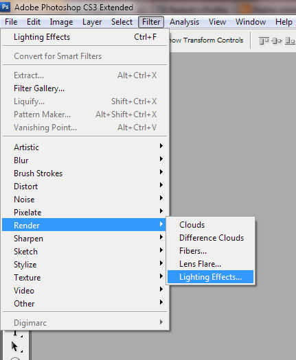 Asegúrese de que capa 1 (la capa con la foto de él) todavía está seleccionada. Ir a "filtro--> Render--> efectos de iluminación..." (ver imagen 1)