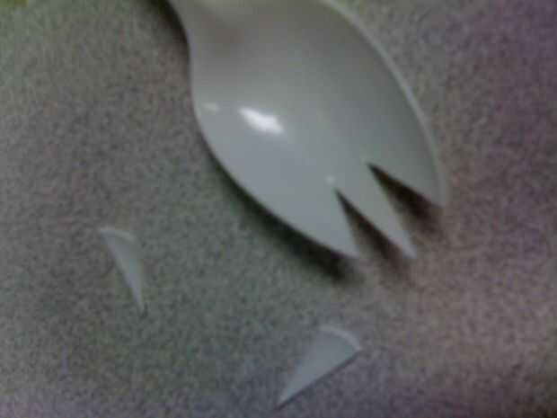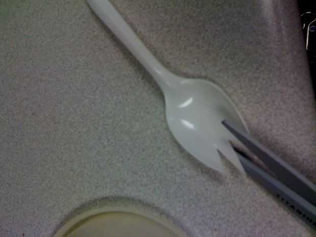 Bien, a partir de la mitad de la parte delantera del cuenco de la cuchara, hacer un ángulo cortado hacia atrás y hacia uno de los bordes exteriores.  Hacer un segundo corte desde el centro va hacia atrás y hacia el borde.  Vas a tener un corte en forma de v en este momento.  Ahora querrá cortar las muescas.  Desplazarse un 3/8 de pulgada de su corte original y hacer un corte que conecta ese lado en el interior del corte original para ese lado.  La pieza que usted retire debe dar forma como un triángulo escaleno.  Hacer lo mismo para el otro lado.  Hice mi cortes a una profundidad de aproximadamente 1/3 de la profundidad de la cubeta de la cuchara.  Usted puede hacer suya más profundo si es su preferencia.  Recuerde: los más "dientes" de su spork, menos rígidos serán.