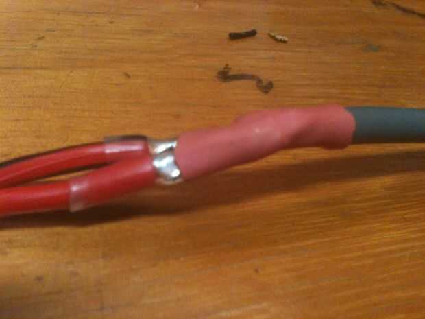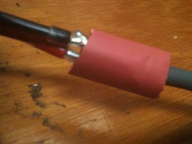 Poner la broca grande de termo retráctil sobre y reducirlo. Asegúrese que el cable rojo y azul están allí. Usé un pedazo corto porque era la única parte que tenía. Estamos casi listos.