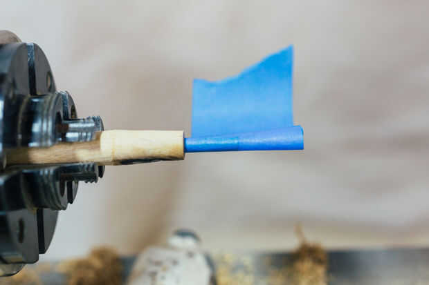 Envolver la cinta de enmascarar alrededor de un par de veces, desgarro el exceso y jam el lápiz sobre el mandril de la mermelada. `