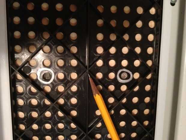 Si nos fijamos en la foto de primer plano de la parte inferior del tablero de mi esposa (tercera foto de este paso), se puede ver que la mayoría de los agujeros son demasiado cerca de las tiras de refuerzo vertical para permitir que los mandos a utilizar fácilmente... pero hay agujeros más o menos centrado en el entre las tiras de refuerzo que funcionan muy bien).